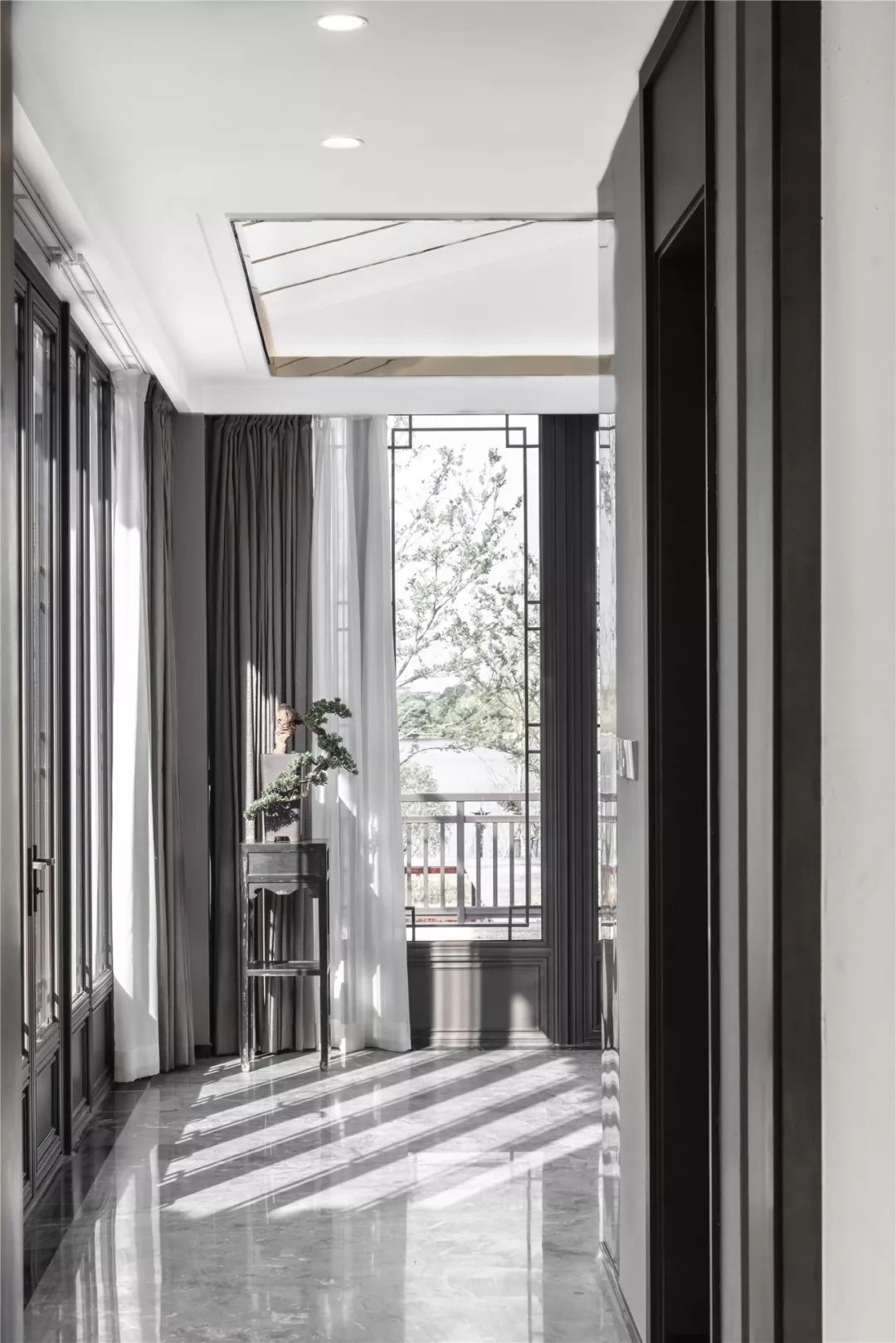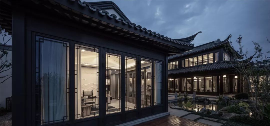 飞檐翘角、高门大院,蓝城桃花源以苏派园林建筑风格营造出古典美学风范。几进落地的大窗、高级灰色调则用更利落的方式回应建筑及院落的规整之美。