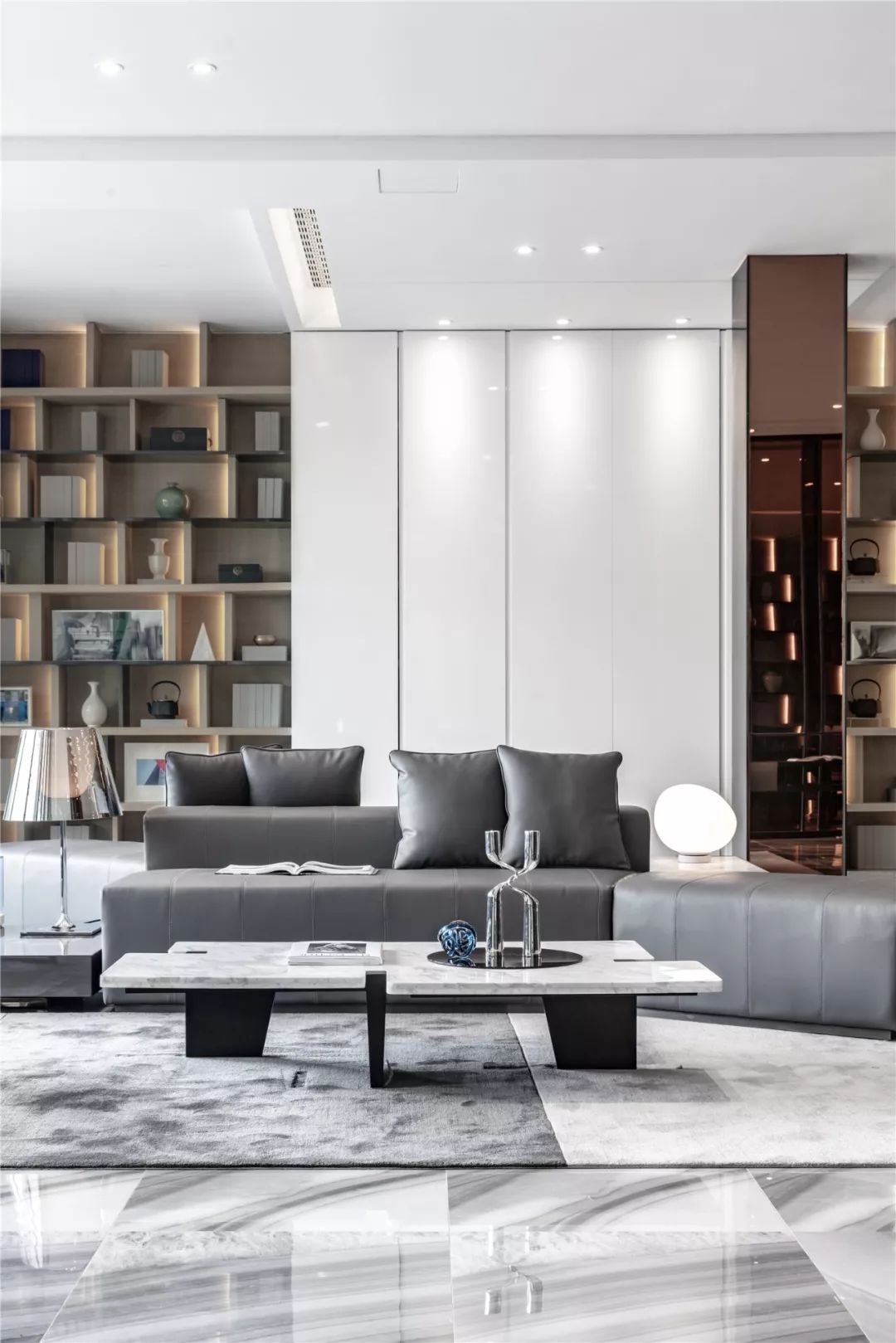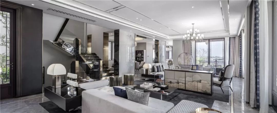 丝质面料定制的绘面柜体让客厅空间在使用上更具灵活性。点缀空间的烛台、花瓶选用Georg Jensen、iittala、Tom Dixon、Jonathan adler等现代简约设计品,在新东方风格的空间中,营造出轻盈灵动的氛围。