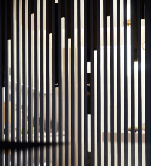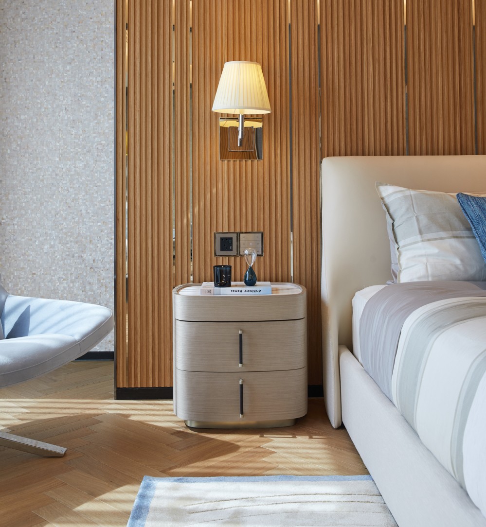 左右立面垂直的金属线条,是毛尖茶叶在上下漂浮、落下,活泼生动的有趣样貌从公共区域延伸到室内空间,用一味茶串起了家人的生活,如此便成了墙上茶碗一般的壁灯,是光辉熠熠、静心圆满。