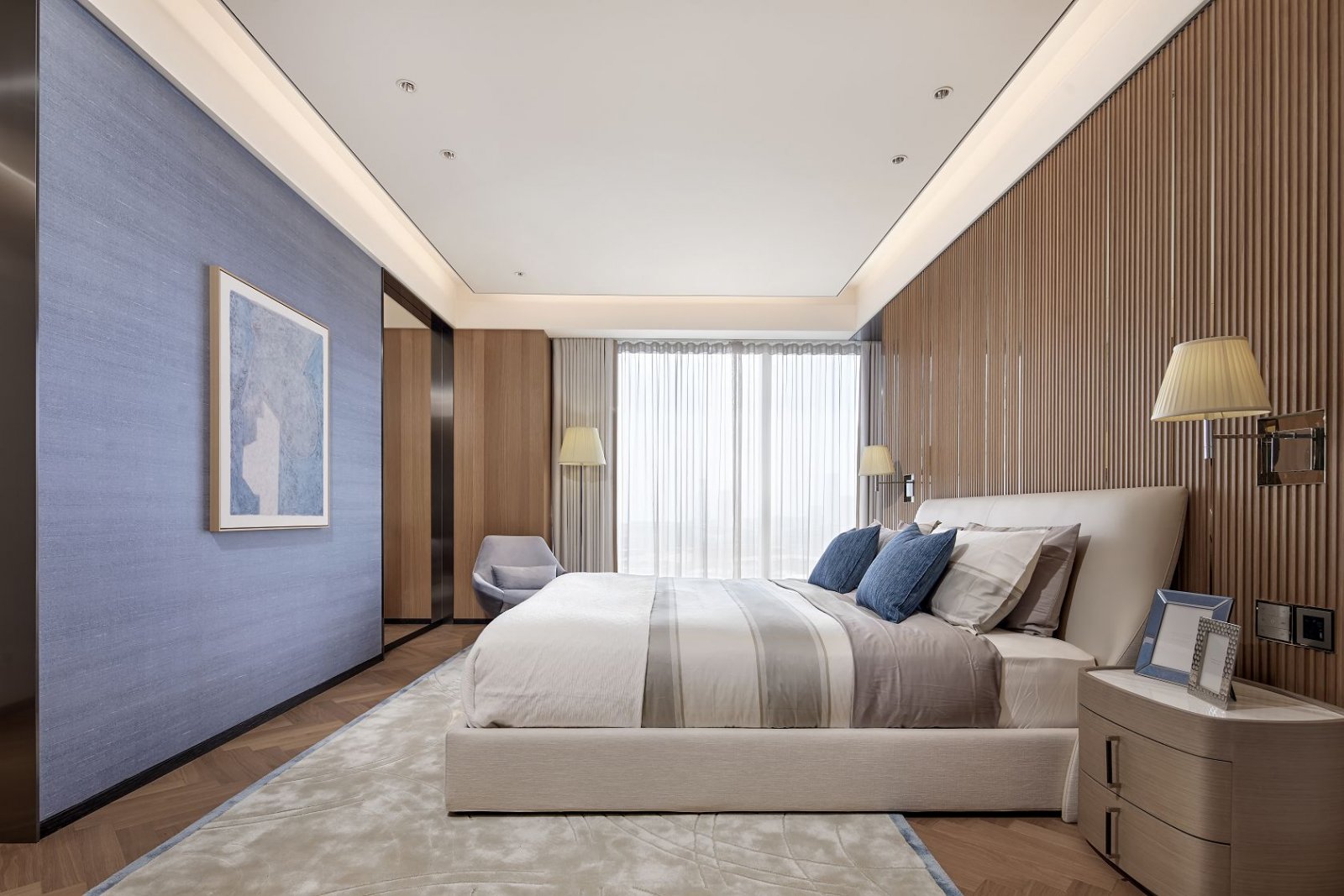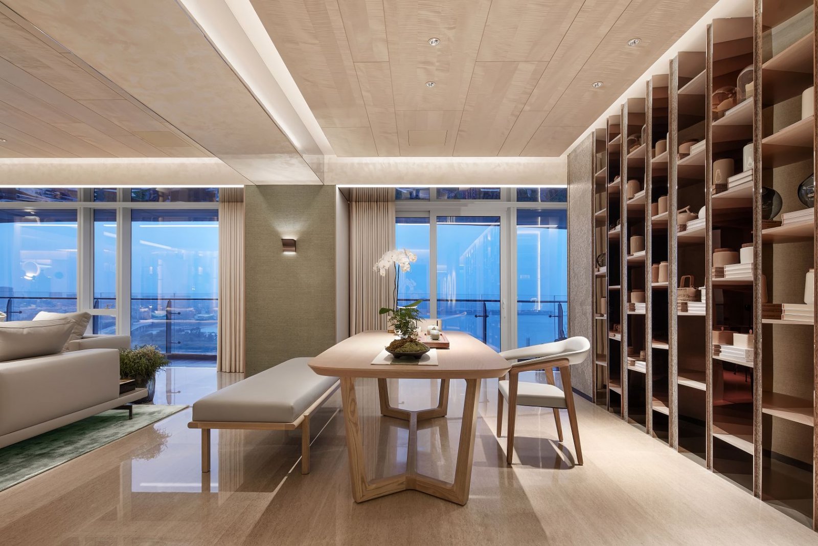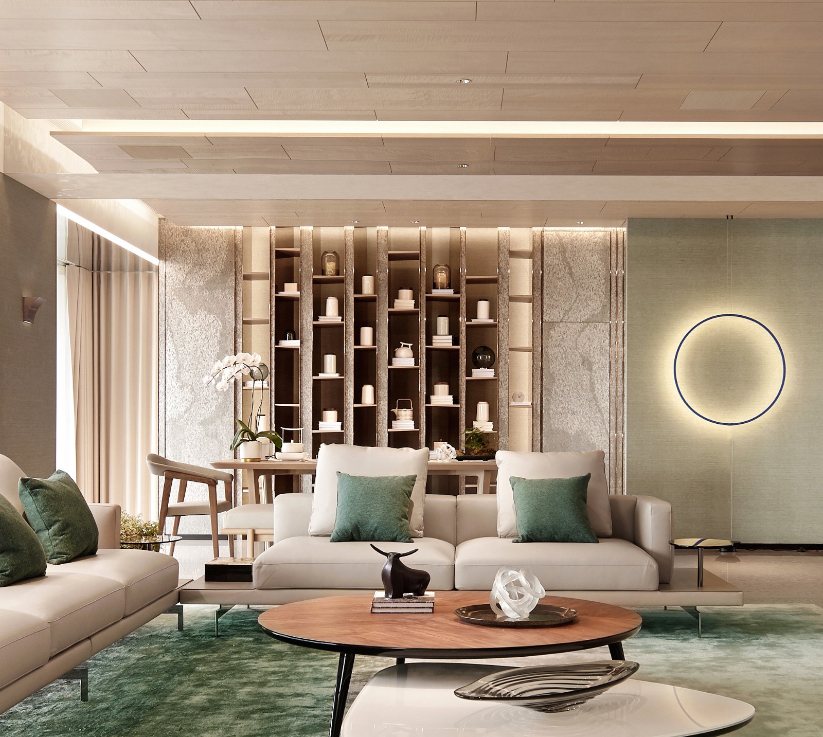推开大门,玄关屏风如竹丝茶卷,若隐若现地预告着接下来的一室清雅,四周颜色如茶叶舒展于水间,由浅至深,白毫银针的波光遍佈天花,立山小种的淡黄大面积的在壁面发散,碧螺春的翠绿在地毯上渐渐浓郁,普洱的乌黑泽沈淀在踢脚,放眼望去仿若不同滋味的芳香甘醇滋润口舌,快意舒于胸臆。