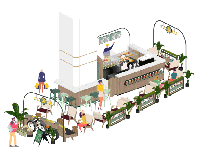 空间外摆的中岛区域,以越南街头的咖啡摊文化为参照,规划为休闲饮品区。区域前端用摩托车、鲜花、绿植等具有越南特色的道具、软装在商场公区营造一场尘世中的越南街景。