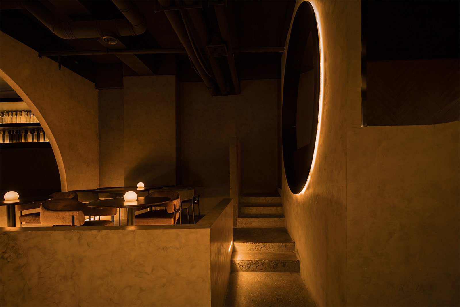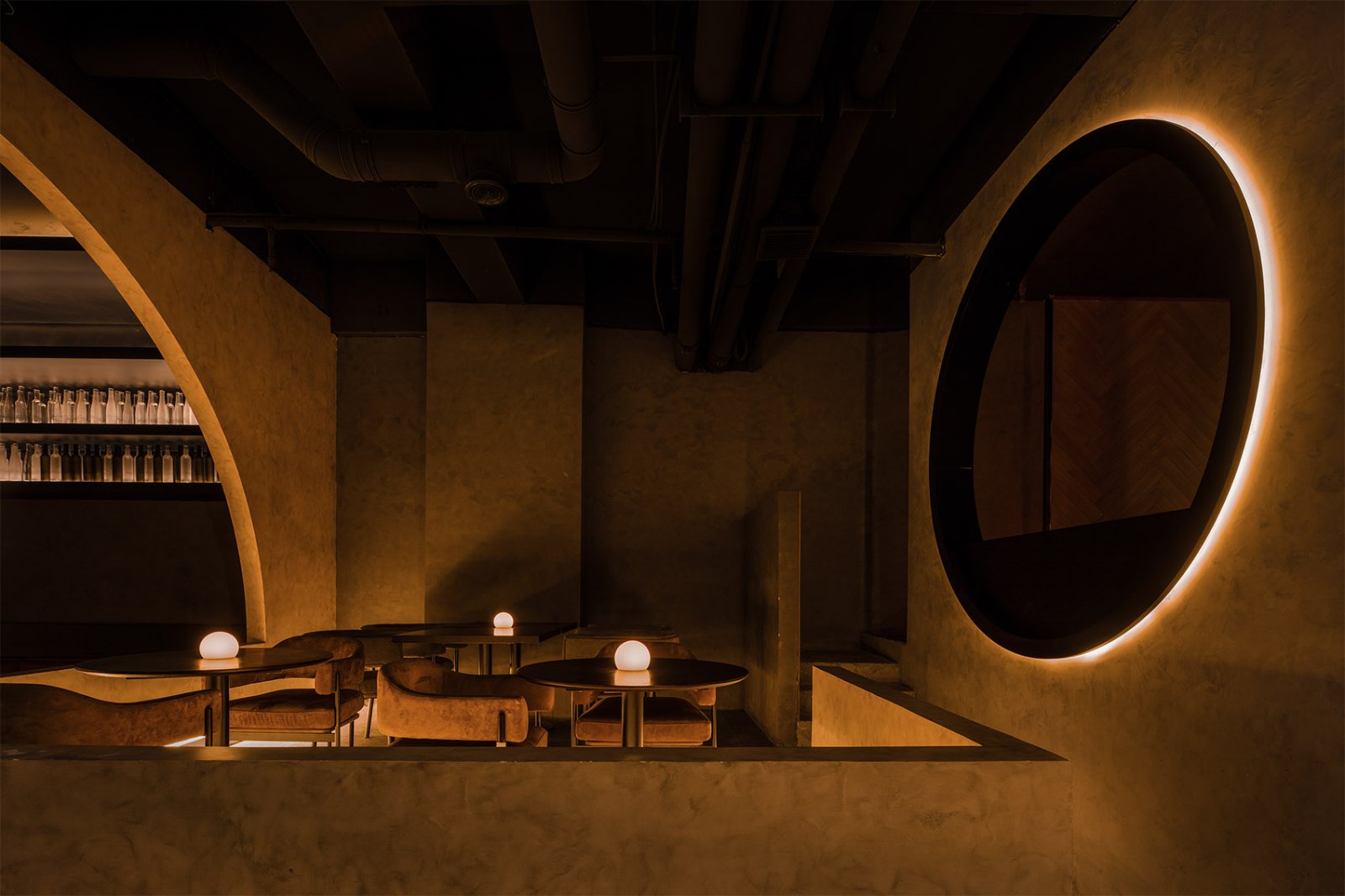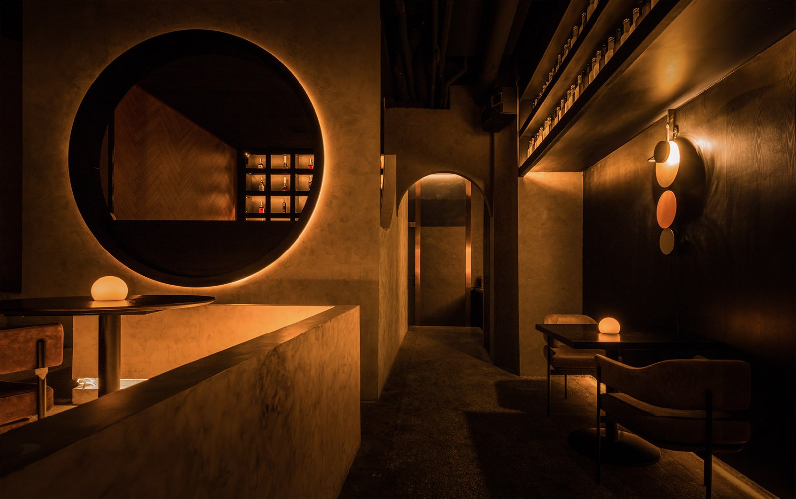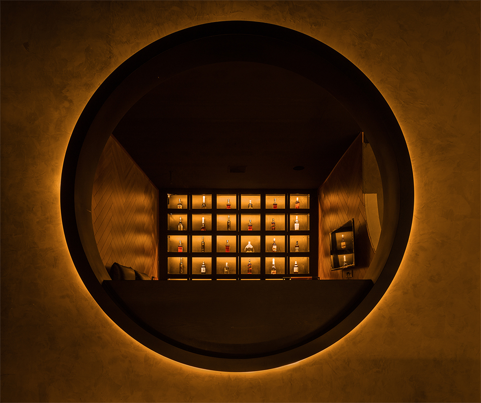 整个空间序列的最内侧为一间半封闭的卡间,卡间朝外侧设置有醒目的圆窗洞,边缘依托灯光形成室内空间中最具精神性的视觉元素。卡间高出地面1.2m,是室内空间中最高也是最私密的区域。卡间内设置有围合状的沙发组,最里侧墙面为酒品展墙,同沙发组一起形成舒适的休憩饮酒区域。