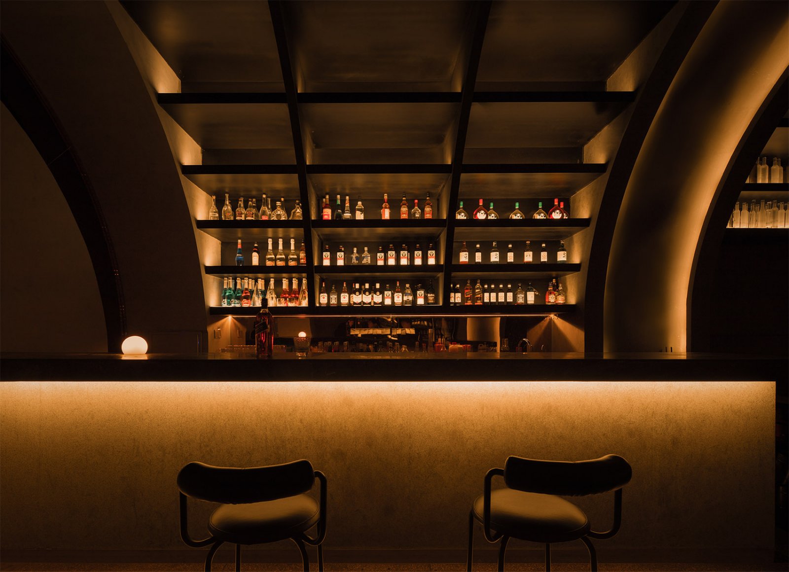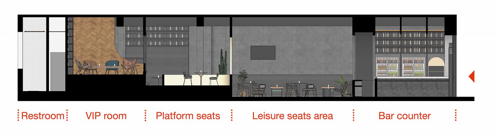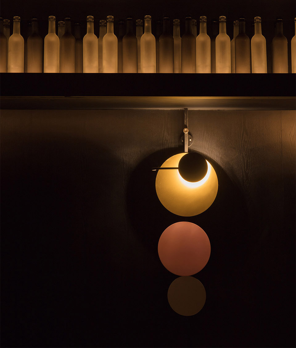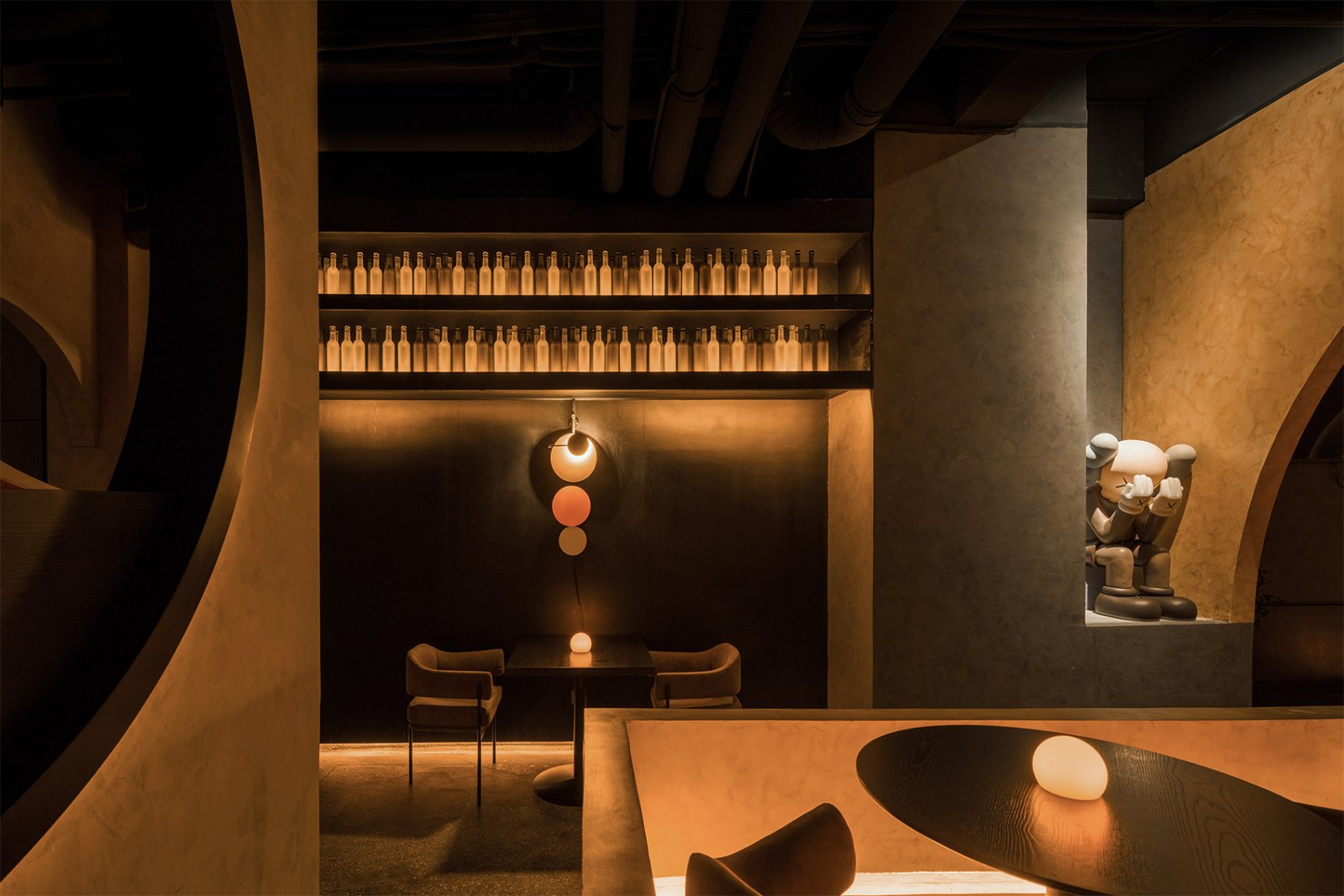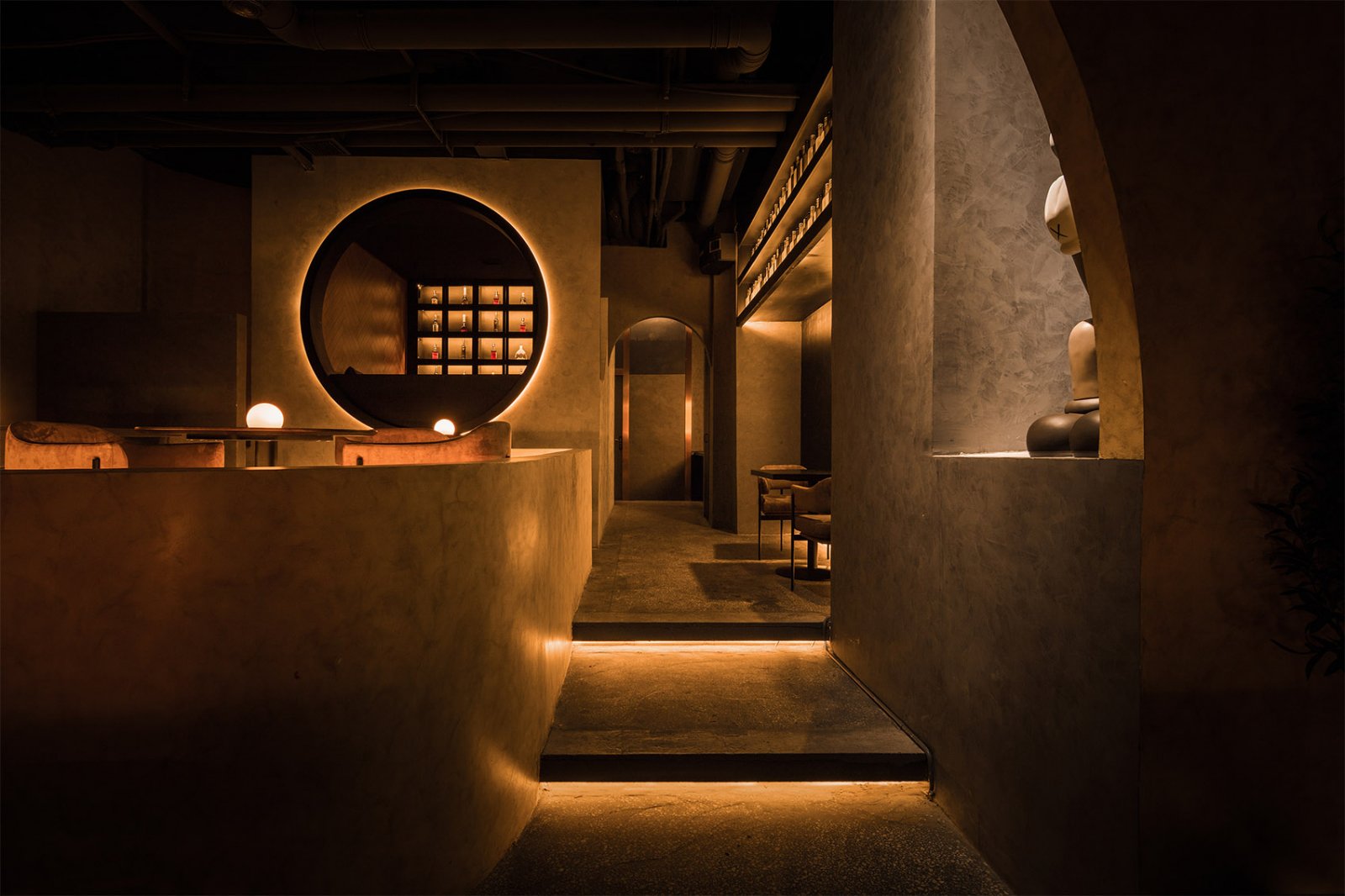 整个空间序列的最内侧为一间半封闭的卡间,卡间朝外侧设置有醒目的圆窗洞,边缘依托灯光形成室内空间中最具精神性的视觉元素。卡间高出地面1.2m,是室内空间中最高也是最私密的区域。卡间内设置有围合状的沙发组,最里侧墙面为酒品展墙,同沙发组一起形成舒适的休憩饮酒区域。