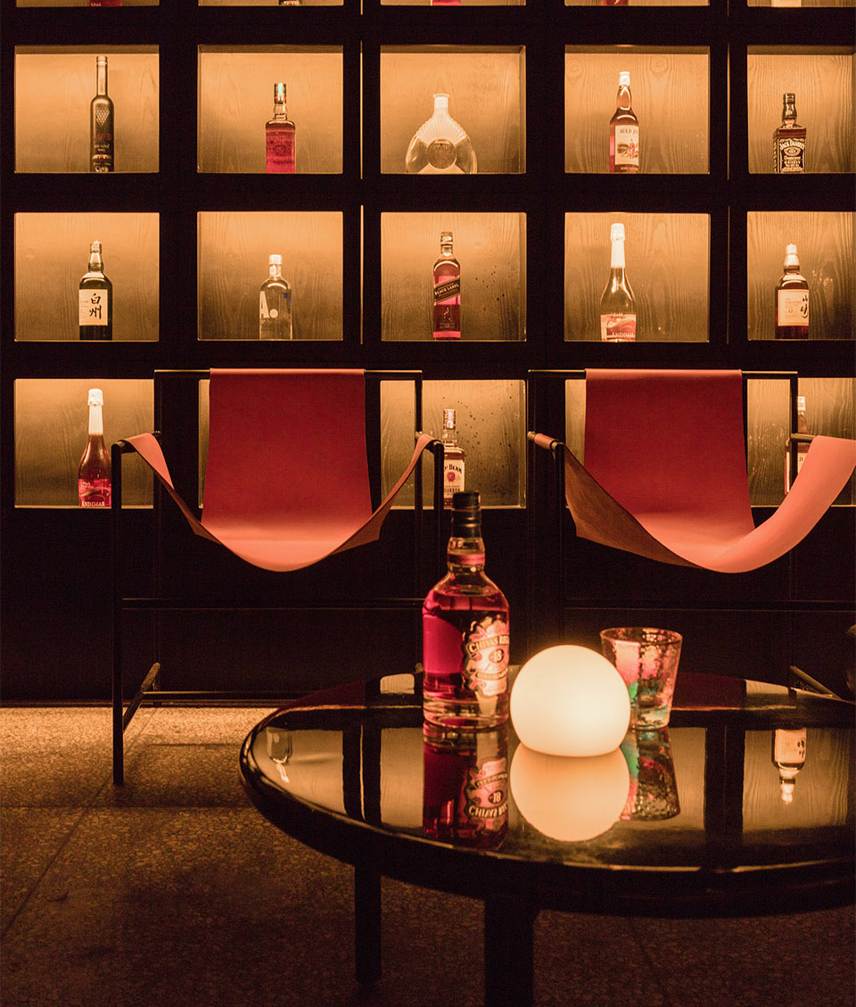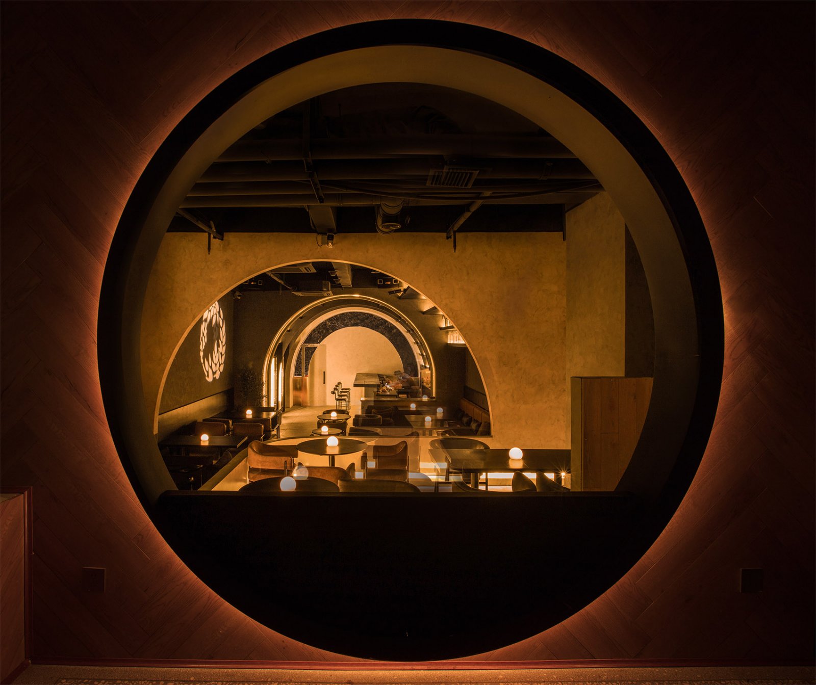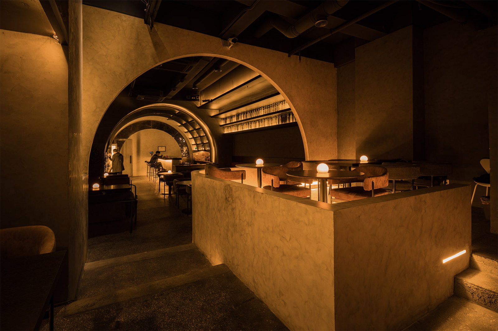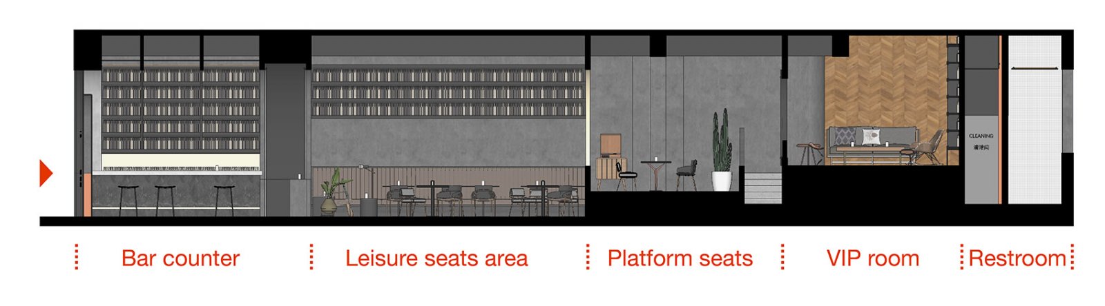 整个空间序列的最内侧为一间半封闭的卡间,卡间朝外侧设置有醒目的圆窗洞,边缘依托灯光形成室内空间中最具精神性的视觉元素。卡间高出地面1.2m,是室内空间中最高也是最私密的区域。卡间内设置有围合状的沙发组,最里侧墙面为酒品展墙,同沙发组一起形成舒适的休憩饮酒区域。