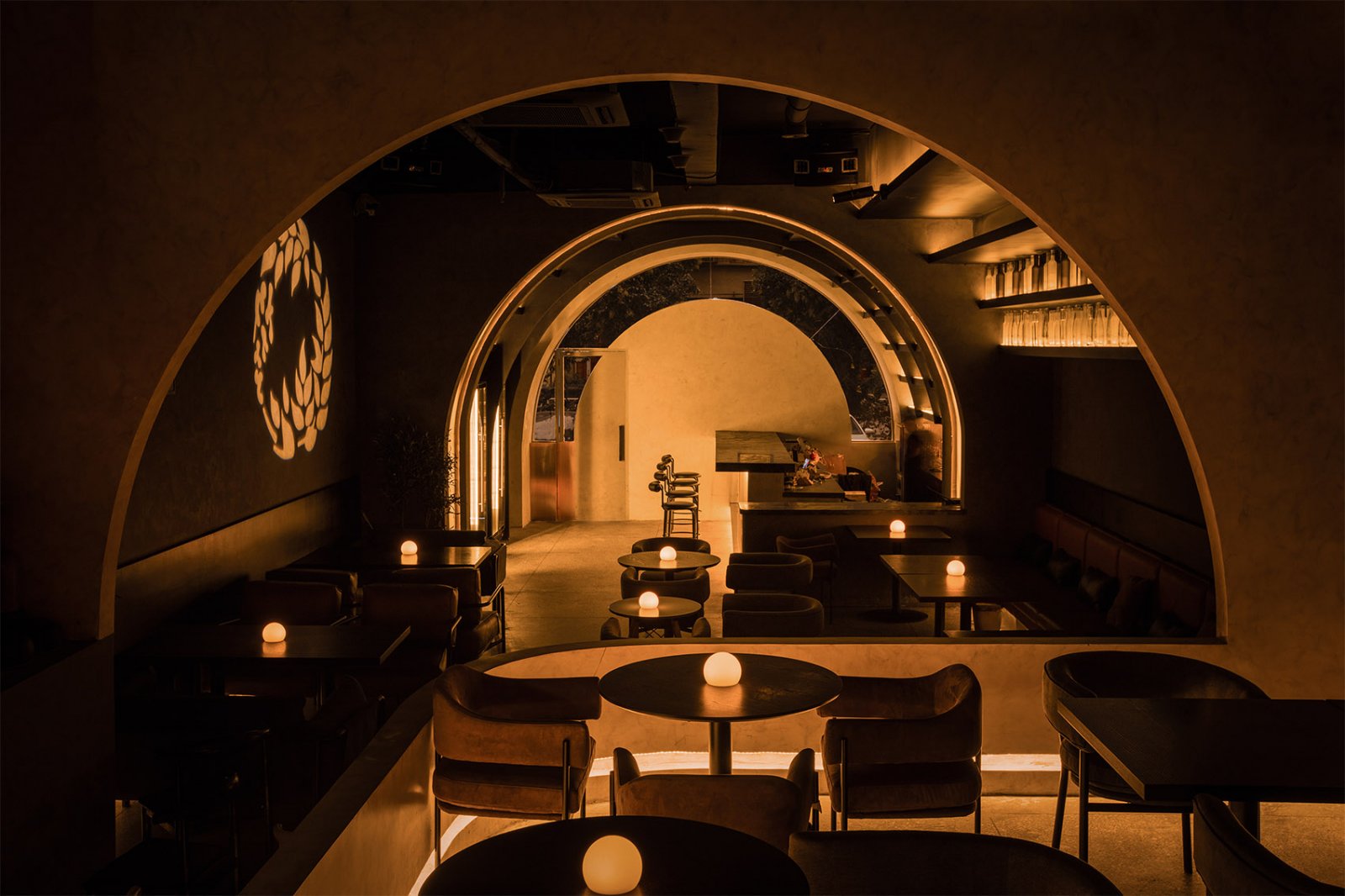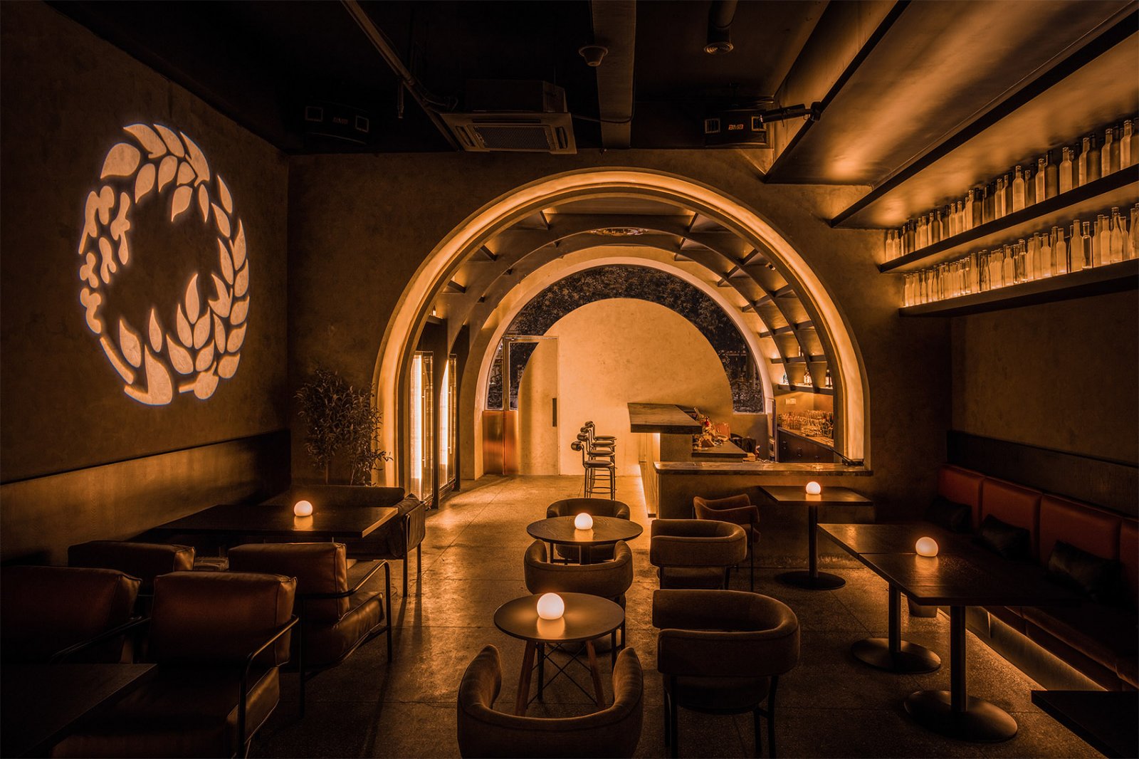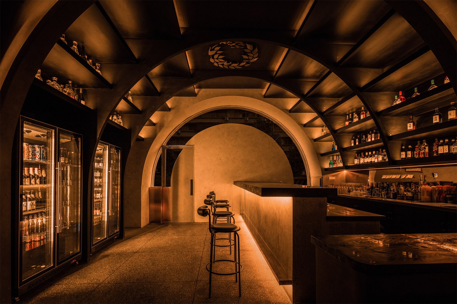 入口处为吧台区域,整个空间依托酒架形成拱形,拱的一侧为调酒吧台及吧台散座,另一侧为啤酒选酒区。