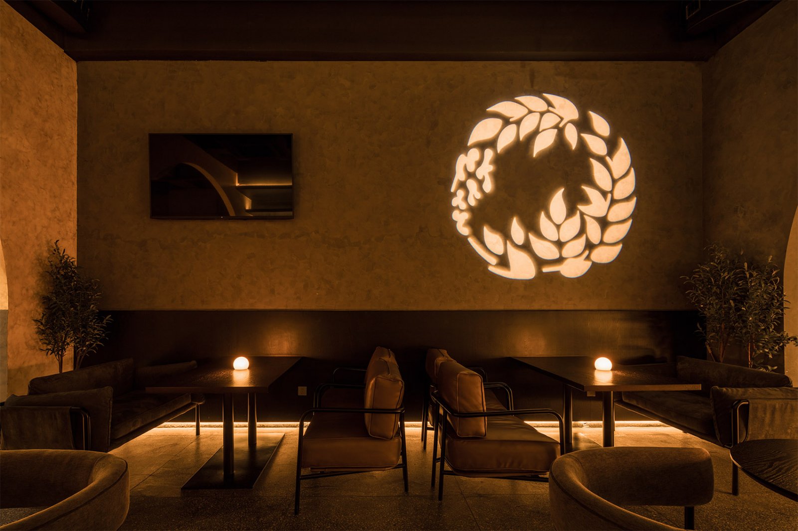 吧台区往里走则是完全开放的散座区域,左侧靠墙的长卡座、中间散布的圆桌椅及右侧的沙发座构成了这一区域。右侧墙上投影有大尺度的酒吧logo,形成藤蔓的图案。