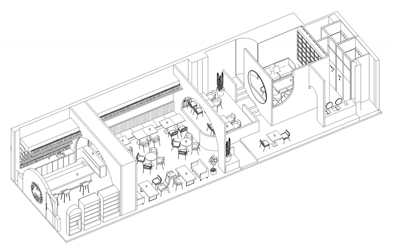 紧邻散座区域为一道大型的圆拱门洞,圆拱门洞底边向内侧卷曲,围合出抬升的平台。平台高出地面0.6m,为一小片半开放的拼桌区,是构成整体空间的第二层。平台的一侧紧邻过道,过道一侧的墙壁上依托墙面凹凸形成不同大小的展示空间,布置有各类装置及艺术品。