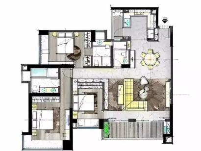 彩平图是室内设计、建筑设计、景观设计等领域中,最基础也最常用的设计图纸之一,是以CAD平面布置图为基础,通过添加色彩、材质纹理、软装标注等元素,将平面布局进行可视化呈现的图纸。