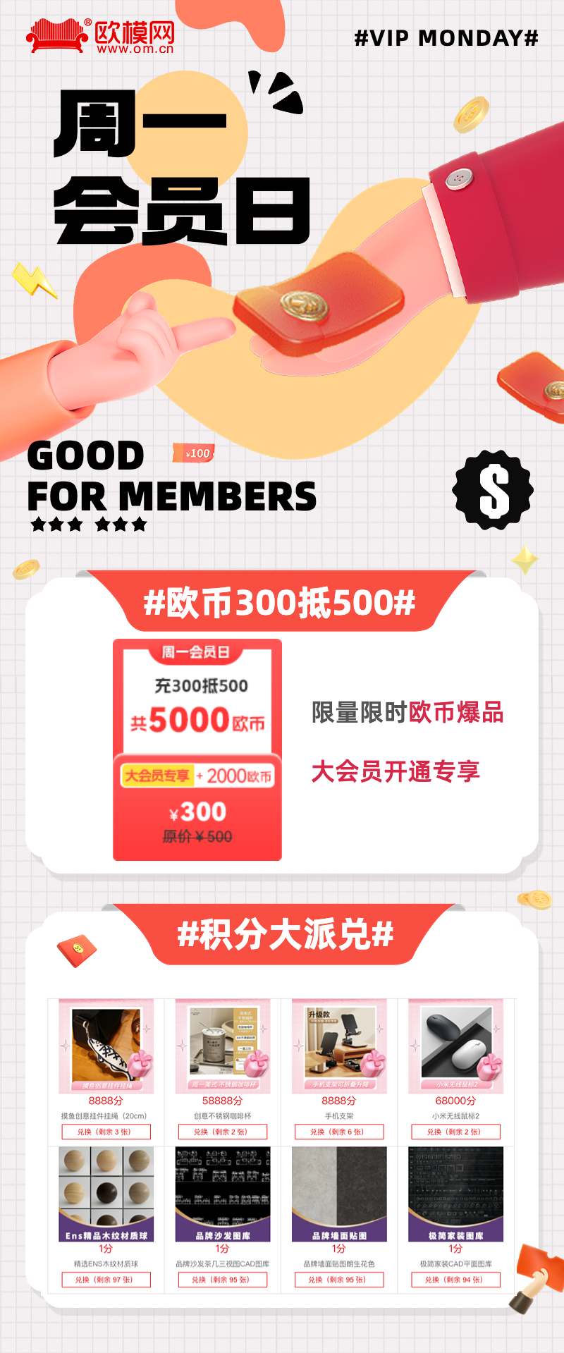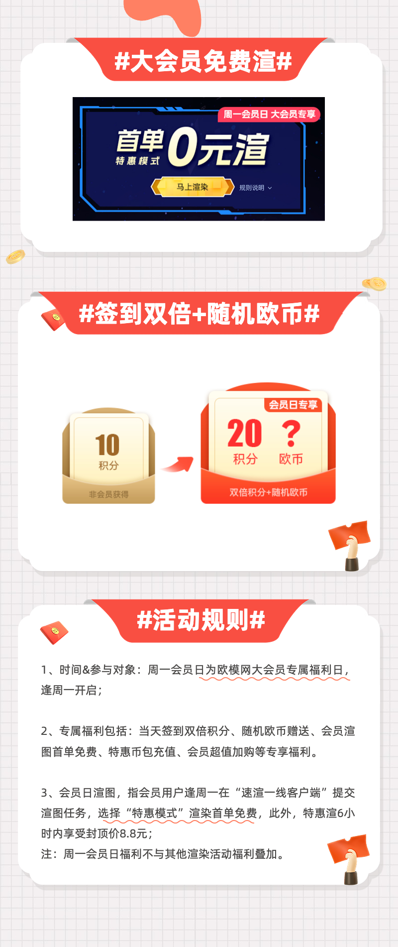 欧模网 > 欧模社区 > 动态 > 活动沙龙 > 「嗨翻周一」0元渲图、欧币充200抵300等会员福利!限时领取!