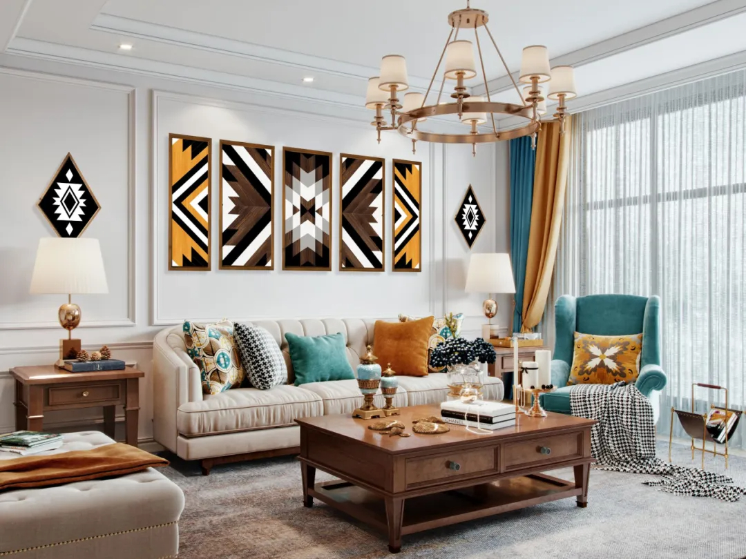 👉 设计灵感建议:利用民族图腾抱枕或墙饰,搭配天然木质与藤编单品,形成空间层次。