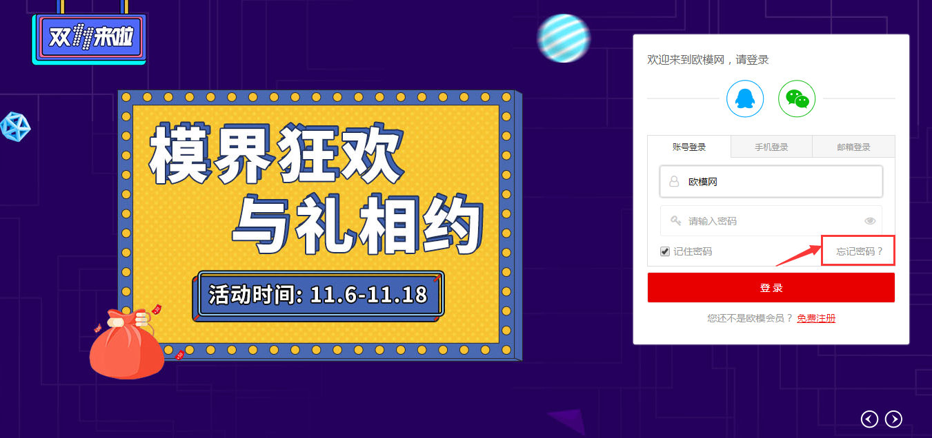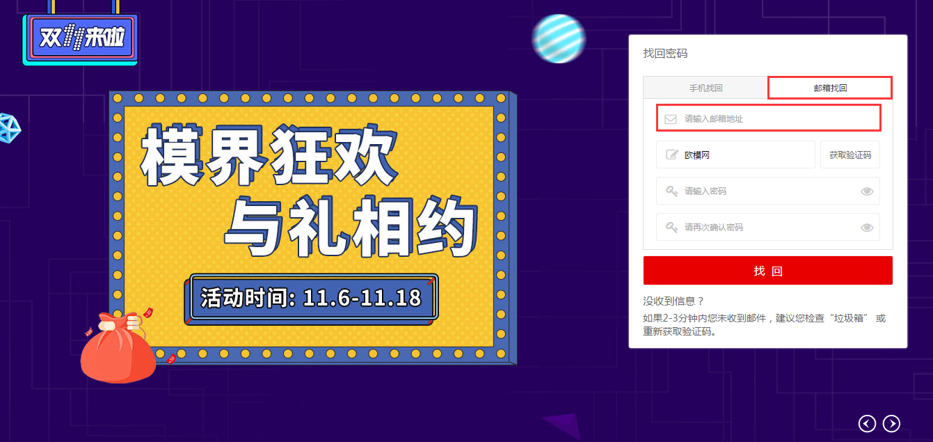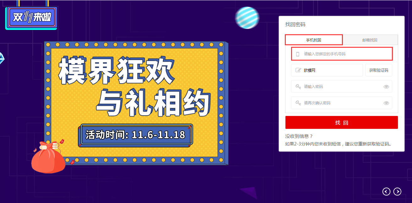 您好!为了进一步保护欧模网用户的账号,提高账号安全性,请您进入管理中心绑定手机/邮箱。绑定手机/邮箱后即可在忘记密码时找回密码,若没有绑定手机/邮箱需要通过人工客服找回密码,在提供准确无误的账号资料后讲进入24小时的申诉期,申诉期内账号处于临时冻结状态,申诉期过后客服将按照正常工作流程予以告知。请联系客服QQ:800013519。