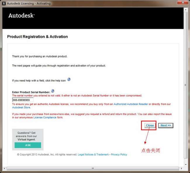这里呢,我们发现并不是我们和我们之前的一样,有输入激活码区。所以有两种激活方法,一种是断网激活,另外一种就是本教程要讲述的:我们先点击关闭,关闭这次激活,然后返回到之前的激活界面 ,再重新点击激活,这时我们会发现自动跳转到输入激活码界面。如图12。