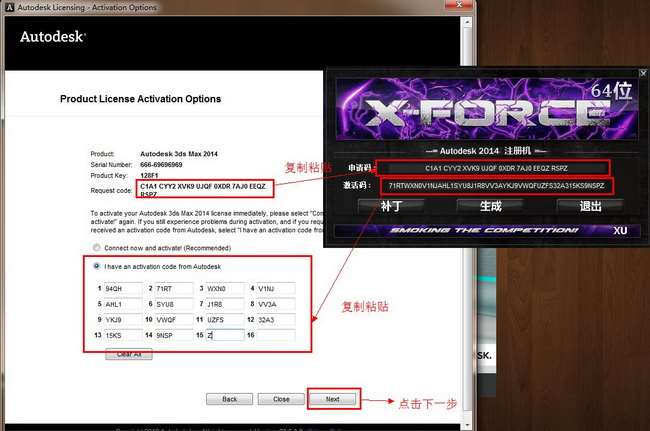 把3dsmax2014 64位中文版里的申请号复制粘贴到注册机的申请号栏中,然后点击计算激活,生成激活码后,把激活码复制粘贴到3dsmax2014 64位中文版激活栏中,最后点下一步如图18。