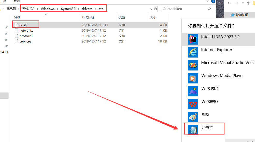 打开C盘,Windows\System32\drivers\etc,选择hosts以记事本打开