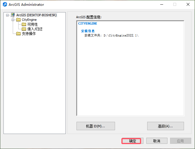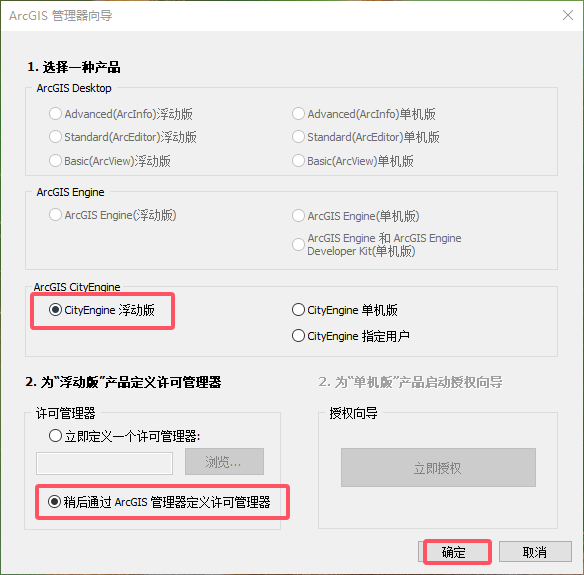 勾选“● cityEngine 浮动版”,然后再勾选“● 稍后通过 ArcGIs 管埋器定义许可管理器”,然后确定
