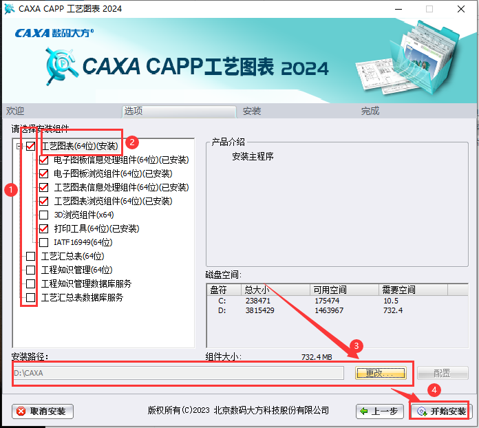 首先将需要安装的组件勾选(根据自己的需求进行勾选),接着点击一下【工艺图表(64位)(安装)】,然后安装路径就会出现,点击【更改】进去更改安装位置(请注意:更改安装位置不能带有中文或者特殊符号),最后就是点击【开始安装】啦