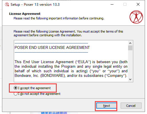 软件许可协议接受,勾选【I accept the agreement】,然后Next