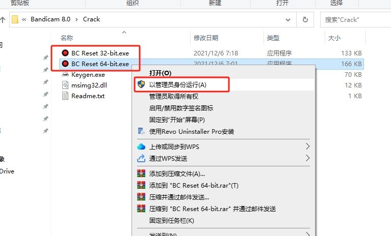 打开Crack文件夹,根据自己的电脑系统选择BC Reset 32-bit.exe或BC Reset 64-bit.exe鼠标右键以管理员身份运行,运行没有任何动静,不用管