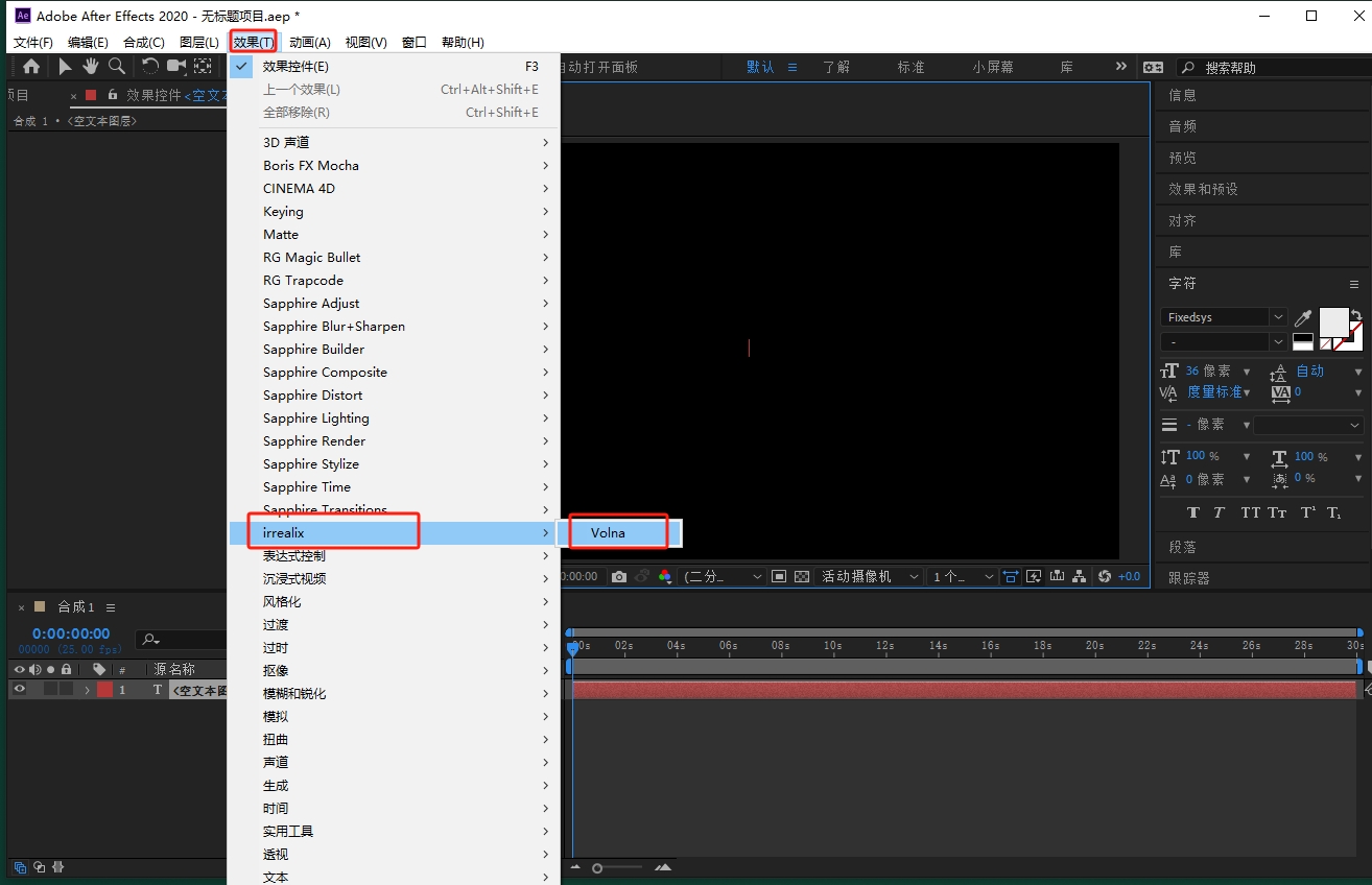 打开AE软件,新建合成,点击效果-irrealix-Volna