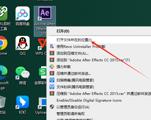 选择AE软件,鼠标右键打开文件所在的位置进入安装目录位置