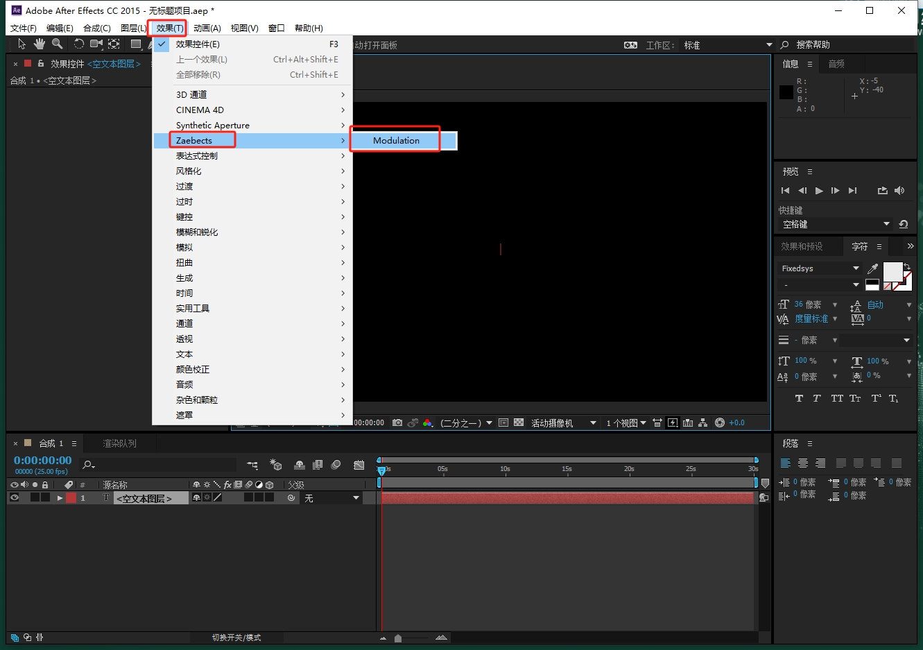 打开AE软件,新建合成,点击效果-Zaebects-Modulation
