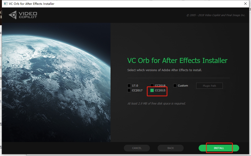 勾选你需要安装的AE软件版本 (若没有你的版本,可以点击Custom,自定义选择AE安装目录下的Plugins即可),这里就以2015版本为例。然后点击INSTALL
