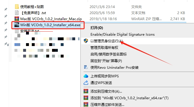 选择“Win版 VCOrb_1.0.2_Installer_x64.exe”鼠标右键以管理员身份运行