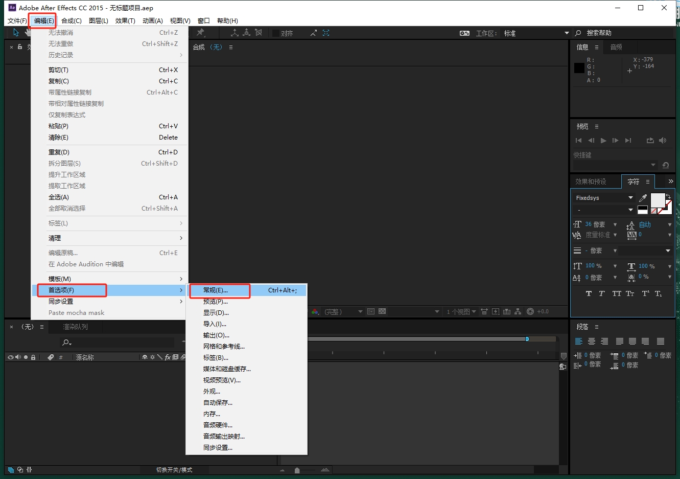 打开AE,在顶部菜单位置,点击编辑-首选项-常规(AE CC2019.1或更高版在: 编辑-首选项-脚本和表达式)
