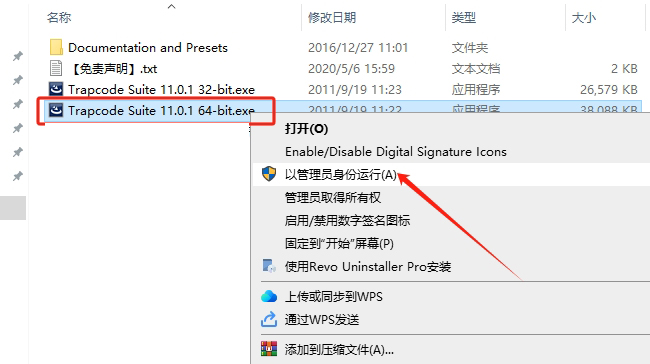 根据自己的电脑系统进行选择安装程序,这里我们就以64位为例进行讲解,鼠标右键以管理员身份运行Trapcode Suite 11.0.1 64-bit.exe