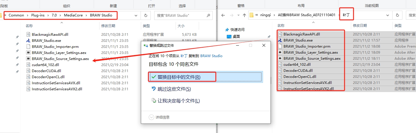 将补丁文件夹里面的所有补丁文件全部复制到C:\Program Files\Adobe\Common\Plug-ins\7.0\MediaCore\BRAW Studio下替换