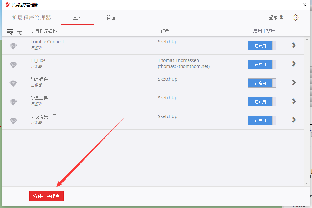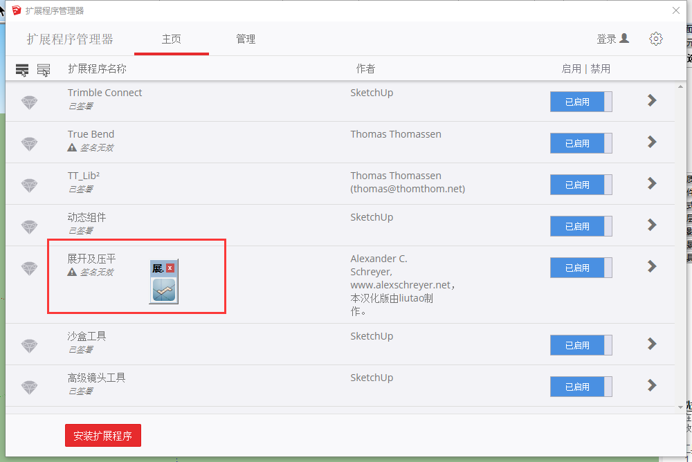 打开草图大师,点击【窗口】-【扩展程序管理器】