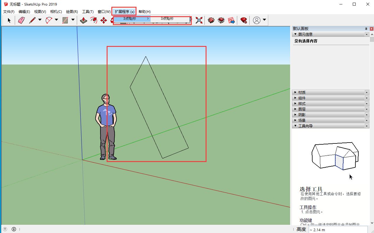 点击扩展程序-3点矩形-3点矩形,在草图大师界面编辑就可呈现3点成矩形图像了