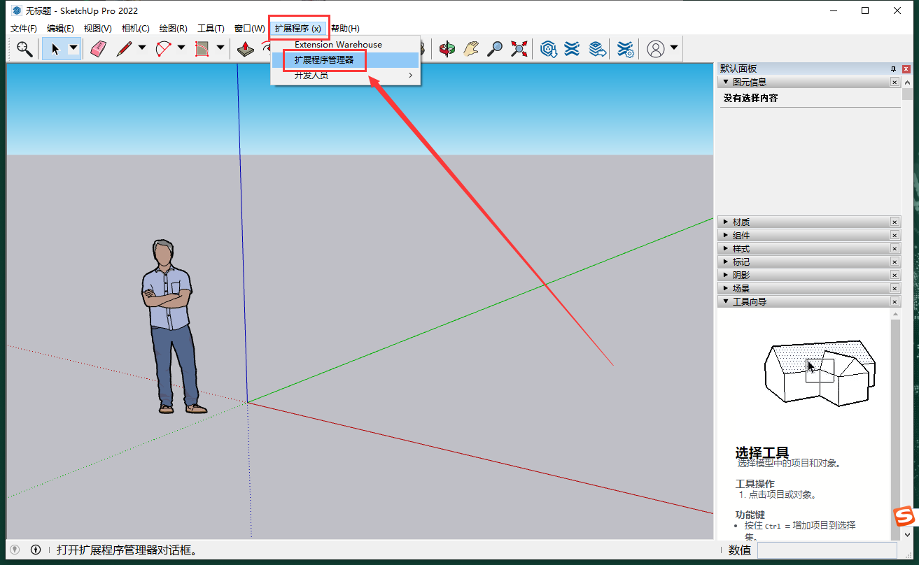 打开草图大师软件,点击【扩展程序】【扩展程序管理器】