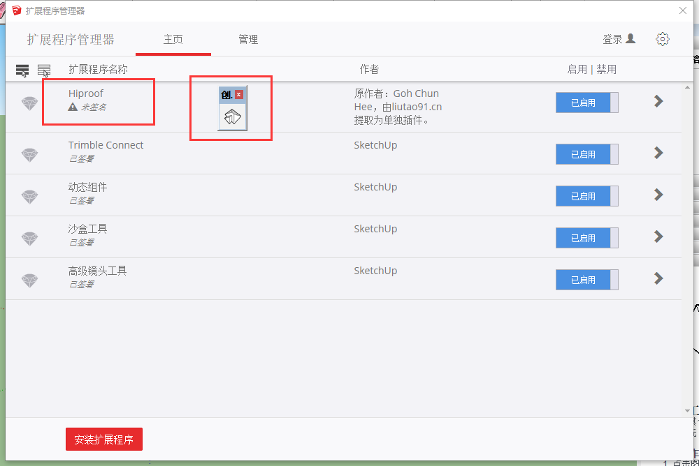 插件安装成功,在扩展程序里面就可以看到1001bit-创建坡屋插件和一个图标了