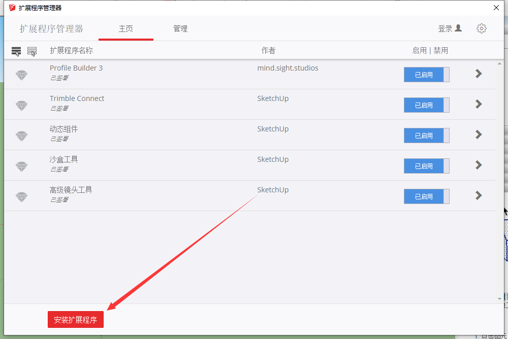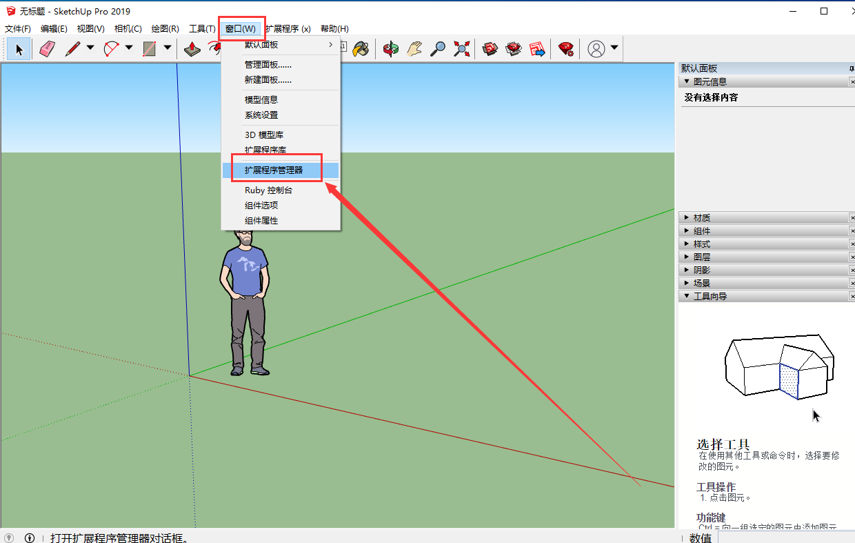 进入草图大师软件,点击【窗口】【扩展程序管理器】