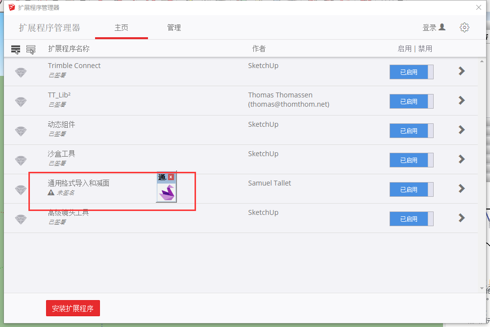 安装成功,此时在扩展程序栏里就有通用格式导入和减面插件和一个功能图标了