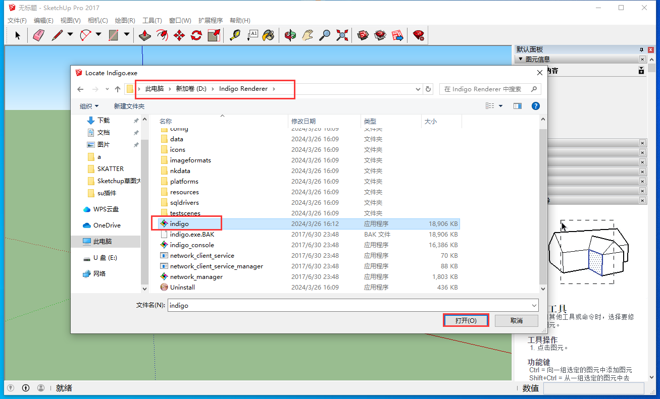 打开草图大师,弹出对话框,再找到安装位置下的indigo程序打开