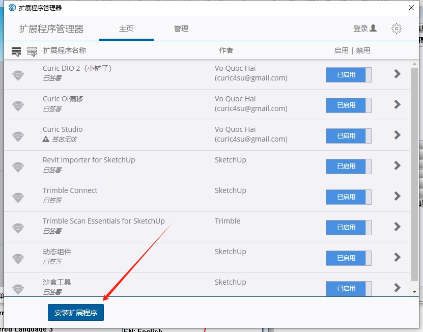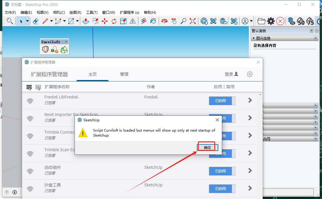 插件安装成功,此时扩展程序栏里就有Fredo6 Curviloft和对应的功能图标