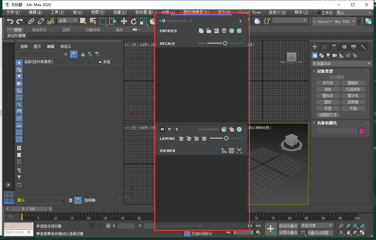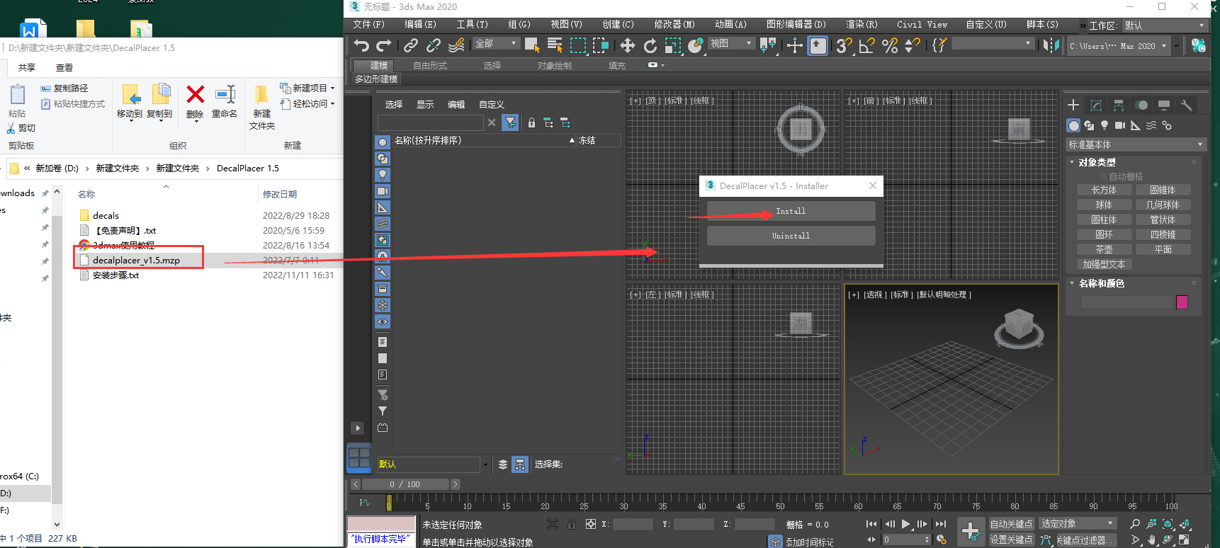 将插件【decalplacer_v1.5.mzp】直接拖动到3dmax软件空白界面,然后弹出小窗口,点击Install
