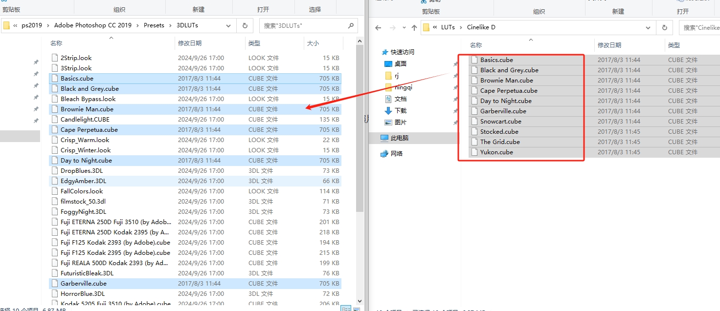 将安装包你需要的预设文件复制到3DLUTs里面