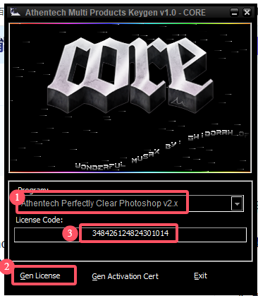 首先现在Athentech Peredly clear Photoshop v2.x 然后点击“Gen license” 接着就生产激活码了 放在一旁不要关闭