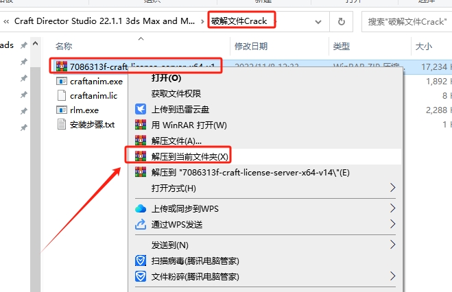 打开破解文件Crack文件夹,鼠标右键解压7086313f-craft-license-server-x64-v14.zip